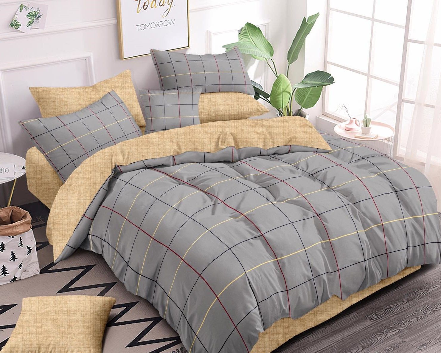Dodaj do swojej sypialni elegancję i klasykę z naszą wyjątkową pościelą z motywem brązowej, żółtej i czarnej kratki na szarym tle. Druga strona - żółta.