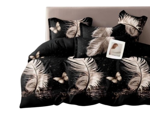 Dodaj do swojej sypialni elegancję i klasykę z naszą wyjątkową pościelą z motywem kremowych piór i motyli na czarnym tle.