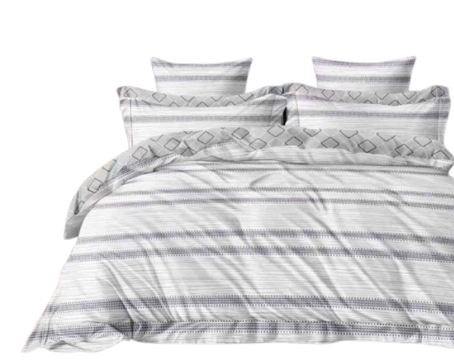 Dodaj do swojej sypialni elegancję i klasykę z naszą wyjątkową pościelą z motywem pasów w odcieniach szarych na białym tle oraz rombów na szarym tle.