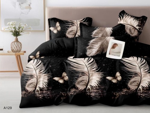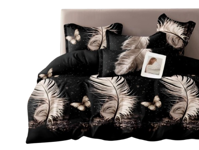Dodaj do swojej sypialni elegancję i klasykę z naszą wyjątkową pościelą z motywem kremowych piór i motyli na czarnym tle.