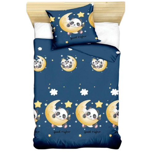 Modna pościel 3D z motywem słodkich pand i księżyców na niebieskim tle.