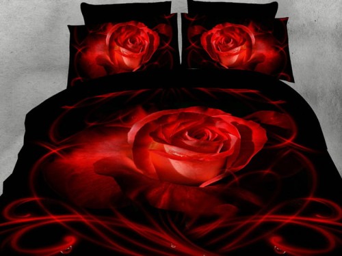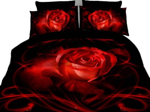 Elegancka pościel 3D z motywem pięknej czerwonej róży na czarnym tle. Druga strona - gładka - czarna.