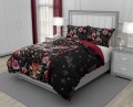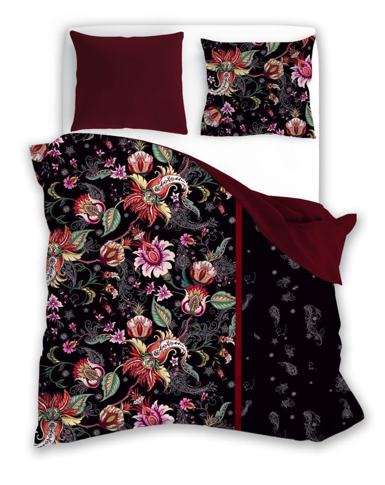 Pościel bawełniana POLSKIEGO PRODUCENTA - FARO z motywem egzotycznych kwiatów na czarnym tle. Druga strona - bordo.