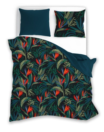 Pościel bawełniana POLSKIEGO PRODUCENTA - FARO z motywem egzotycznych kwiatów i liści. Druga strona - niebieska.