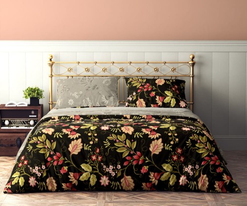 Elegancka pościel z motywem florystycznym w odcieniach koloru czerwonego, beżowego i zielonego na czarnym tle.