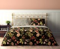 Elegancka pościel z motywem florystycznym w odcieniach koloru czerwonego, beżowego i zielonego na czarnym tle.