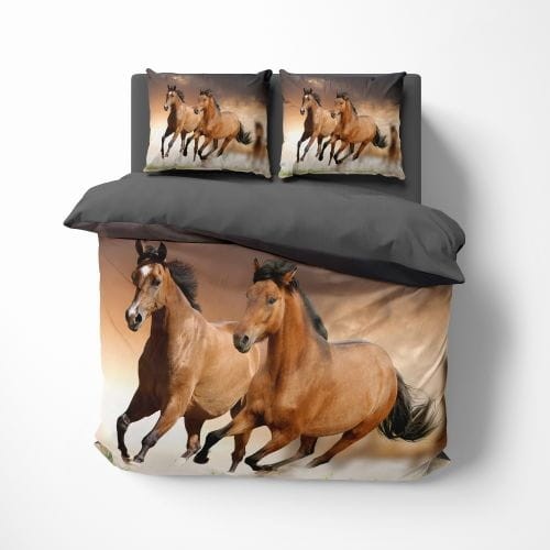 Dodaj swojej sypialni magii i elegancji dzięki tej wyjątkowej pościeli z motywem gniadych koni na brązowo-beżowym tle.