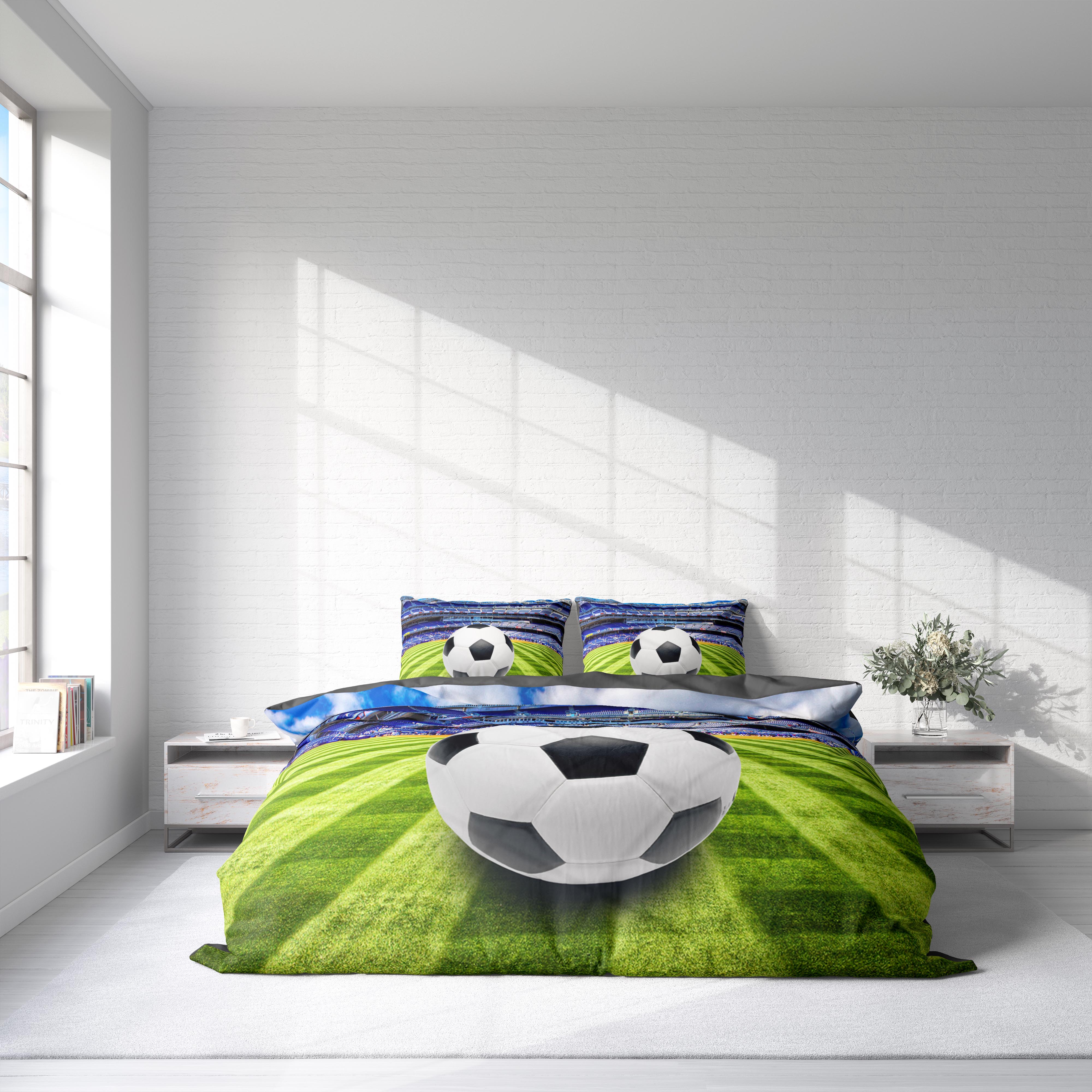 Odkryj młodzieżową pościel z motywem piłki nożnej– idealny wybór dla fanów futbolu i komfortu. Jedna strona zachwyca dynamicznym nadrukiem, tworzącym wrażenie trójwymiarowości i otwartej przestrzeni. Druga strona to gładka, ciemnoszara tkanina, która dodaje elegancji i wszechstronności.