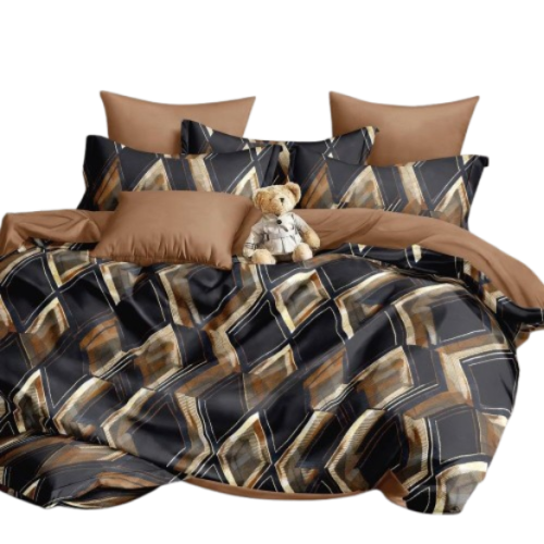 Komplet pościeli z motywem rombów w stonowanych kolorach - beż, granat, brąz na czarnym tle. Druga strona - jasno-brązowa.
