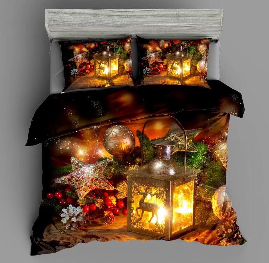 Wprowadź magię świąt do swojej sypialni dzięki tej wyjątkowej pościeli! Nadruk przedstawia nastrojowy lampion z motywem renifera, otoczony świątecznymi ozdobami, takimi jak bombki, szyszki i rozświetlone dekoracje – wszystko w ciepłej, bożonarodzeniowej kolorystyce.