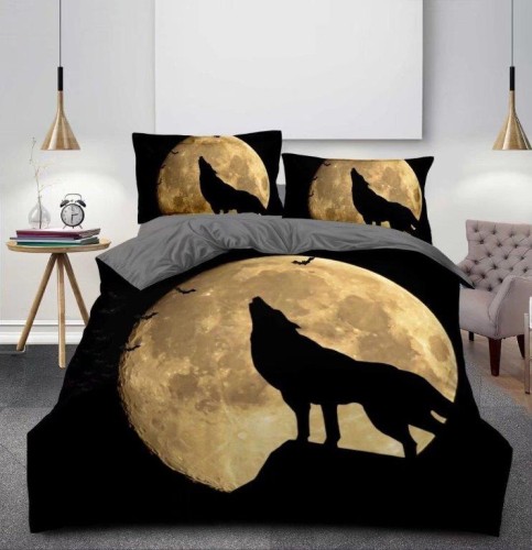 Elegancka, stylowa pościel z motywem wilka na tle pełni księżyca. Druga strona gładka - szara.