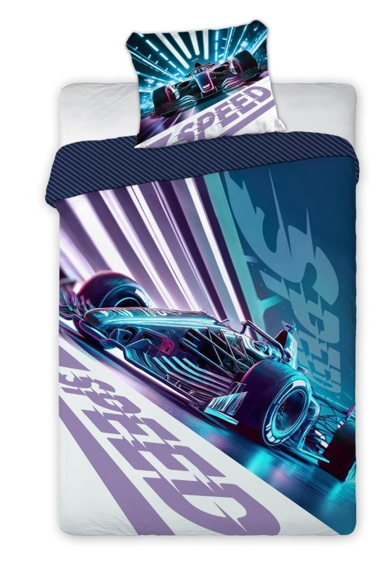 Elegancka pościel z motywem formuły 1 na niebiesko- fioletowym tle. torze. tle. Druga strona - granatowa w pasy.