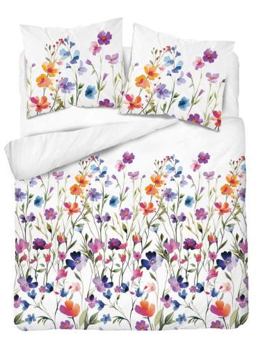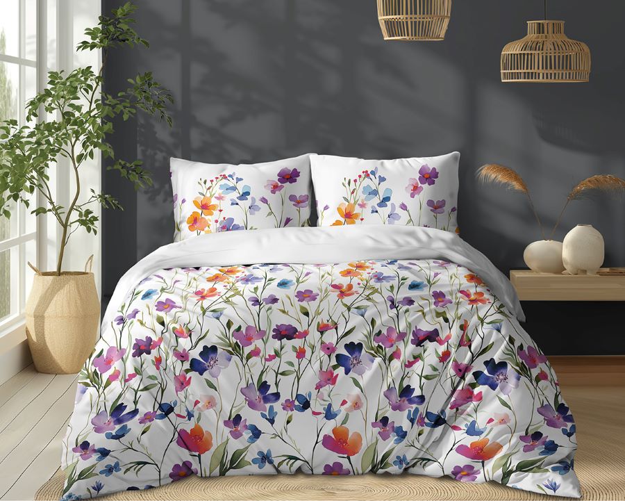 Pościel bawełniana 100% w delikatny, barwny kwiatowy wzór to doskonały wybór dla osób, które cenią naturalne tkaniny, komfort snu i świeży, elegancki wygląd sypialni. Jasne tło połączone z lekkim motywem kolorowych polnych kwiatów sprawia, że komplet prezentuje się subtelnie, romantycznie i bardzo stylowo.