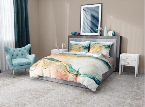 Elegancka pościel w abstrakcyjny wzór w kolorze złota i turkusu. Druga strona - beżowa.