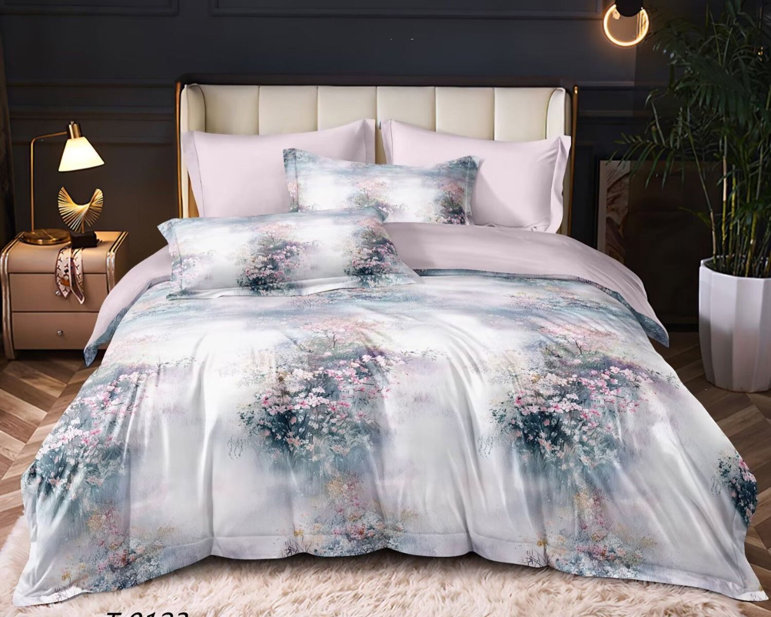 Szukasz stylowej pościeli, która nada Twojej sypialni wyjątkowego charakteru? Pościel 160x200 z romantycznym, kwiatowym pejzażem w pastelowych odcieniach - niebieskiego, różu jest dla Ciebie. Druga strona pościeli jest w neutralnym - popielato-beżowym kolorze.