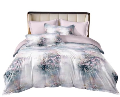 Szukasz stylowej pościeli, która nada Twojej sypialni wyjątkowego charakteru? Pościel 200x200 z romantycznym, kwiatowym pejzażem w pastelowych odcieniach - niebieskiego, różu jest dla Ciebie. Druga strona pościeli jest w neutralnym - popielato-beżowym kolorze.