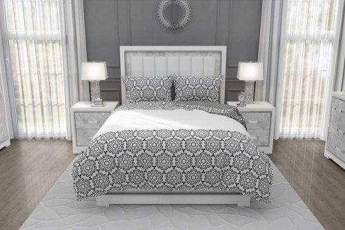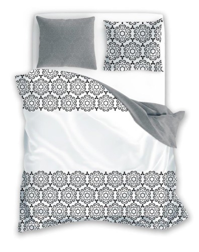 Elegancka pościel w klasyczne wzory na białym tle. Pościel gładka - szara z drugiej strony,