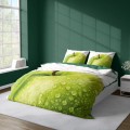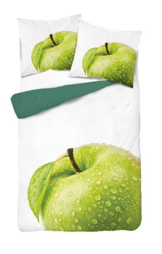 Elegancka pościel z motywem soczystego, zielonego jabłka na białym tle. Druga strona ciemno-zielona.