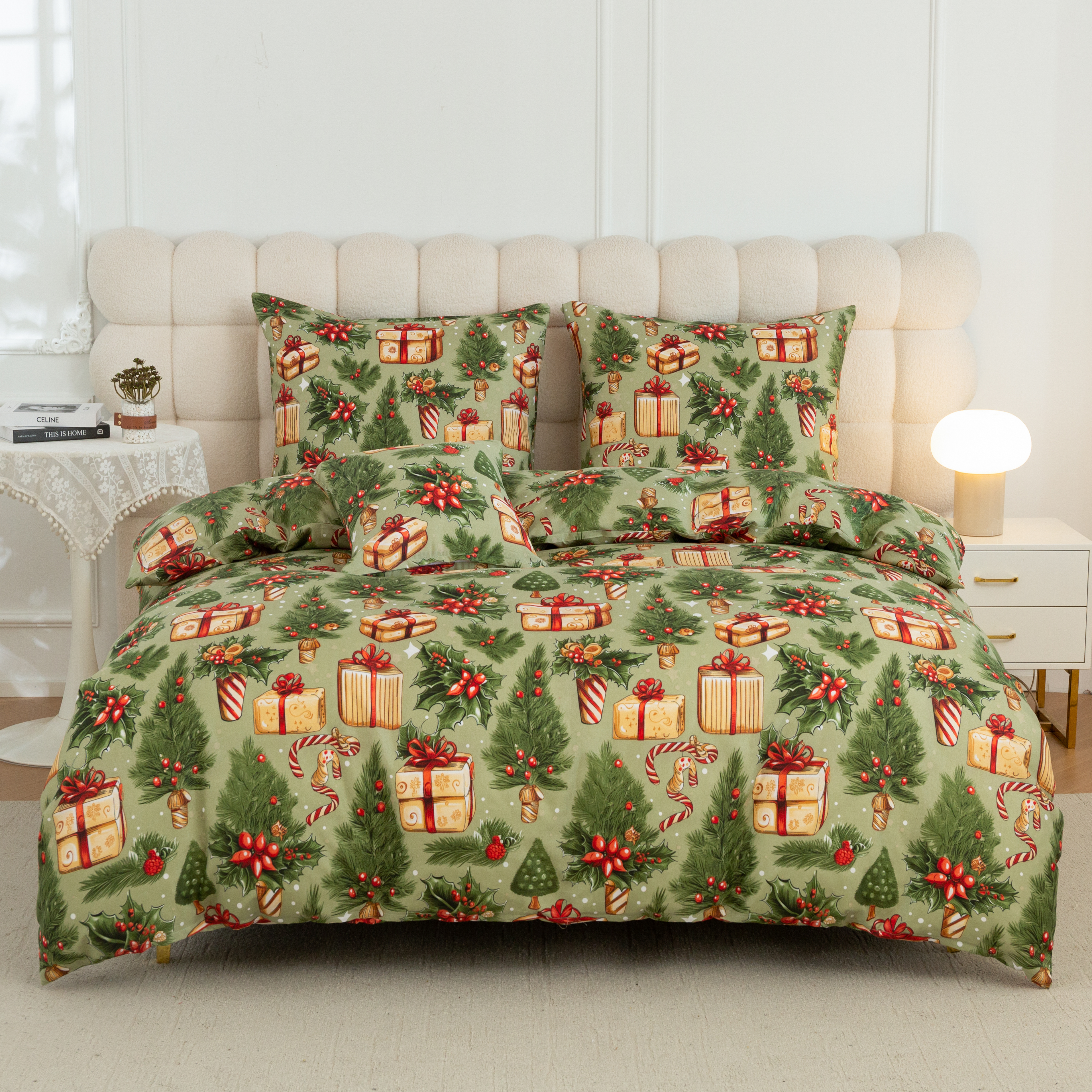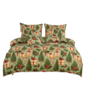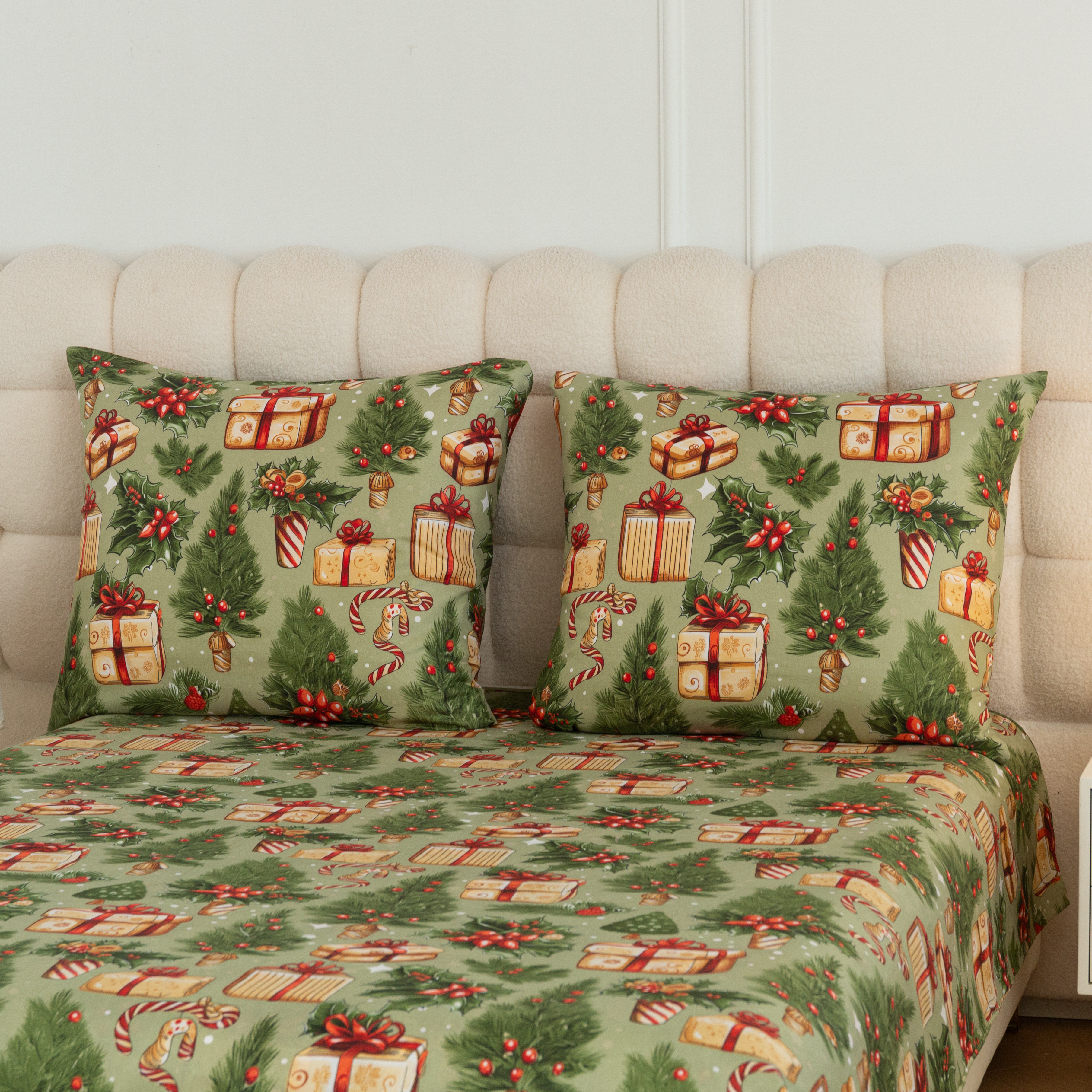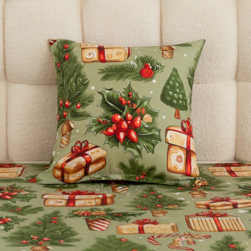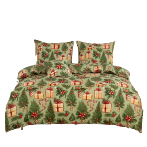 Wprowadź do swojej sypialni magiczną atmosferę Świąt dzięki wyjątkowej pościeli w jasno-zielonym kolorze. Wzór zdobią prezenty, choinki i stroiki.