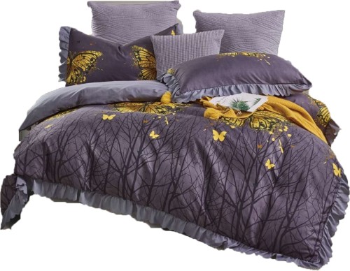 Elegancka pościel w żółte motyle i gałązki na grafitowym (wpadającym w fiolet) tle wykończona finezyjną szarą falbanką na dole i po bokach pościeli. Druga strona - szara, jednokolorowa.