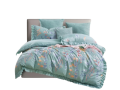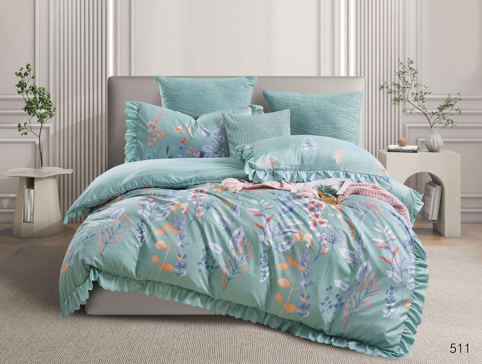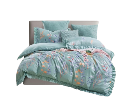 Delikatny, roślinny wzór na miętowym tle wprowadza do wnętrza świeżość i lekkość, a ozdobna falbanka wokół poszwy i poduszek nadaje całości wyjątkowo dekoracyjny charakter. Taki komplet pięknie prezentuje się na łóżku i sprawia, że sypialnia wygląda bardziej elegancko i przytulnie.